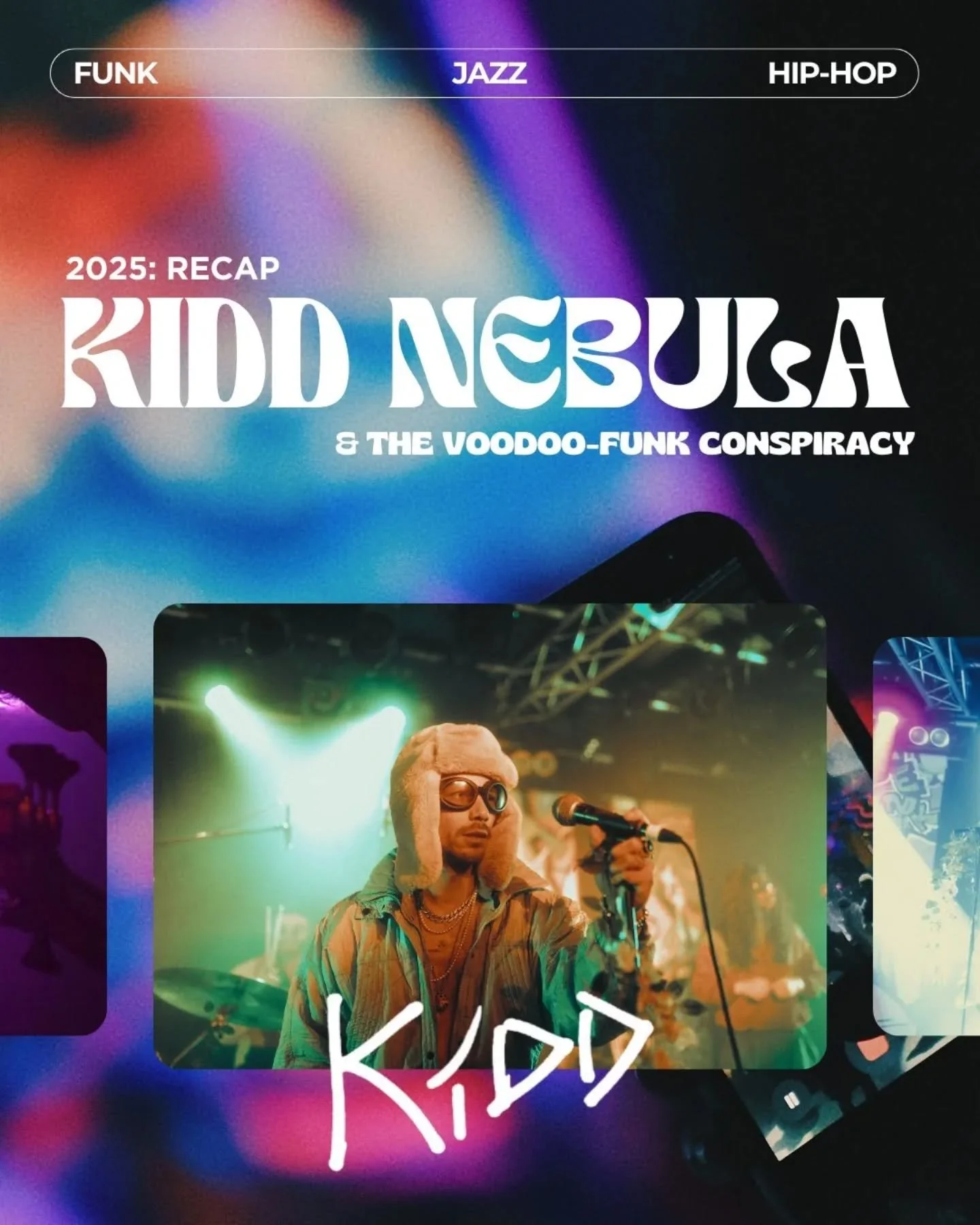 in 2025, after performing solo for 5 years, Kidd returns to the stage with a full six-piece band - transforming his self-produced indie-funk tracks into an eclectic live experience, adding a pinch of experimental jazz and loads of showmanship to the mix. set in Kiddβs self-designed stage called: THe alien jungle, he IMMERSES the audience in a full jazzy indie-funk experience for all your hearts and ears.